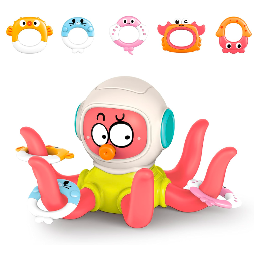 El juguete incluye un simpático pulpo y cinco anillos que se lanzan y apilan sobre sus tentáculos. La diversión no se hunde: flota, gira y mantiene a tu peque entretenido mientras se limpia sin dramas.